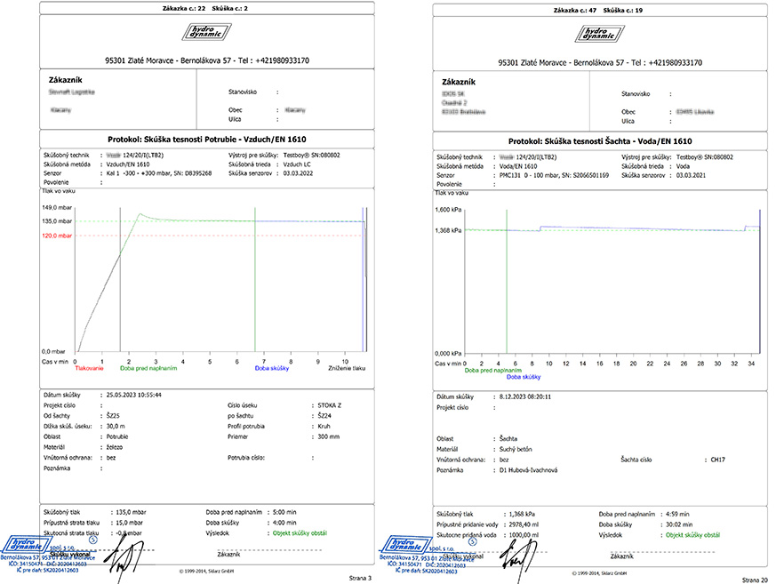 Protokol: tlaková skúška potrubia - Vzduch / EN1610 a Tlaková skúška šachty - Voda / EN1610